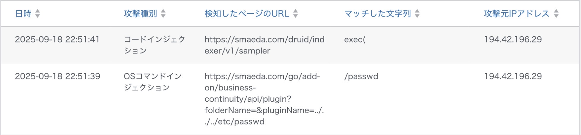 2025年9月18日22:51に立て続けに「OSコマンドインジェクション」攻撃、「コードインジェクション」攻撃を受け、WAFがブロックしました。