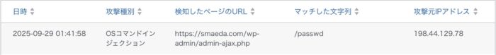 HOMENews 「OSコマンドインジェクション」攻撃をブロックしました 2025年9月29日 News 8 Views WAFが「OSコマンドインジェクション」攻撃をブロックしました。 IPアドレスはアメリカからのアクセスのように偽装されており、私のもう一つのブログにもほぼ同じ時間に同様の攻撃が行われました。