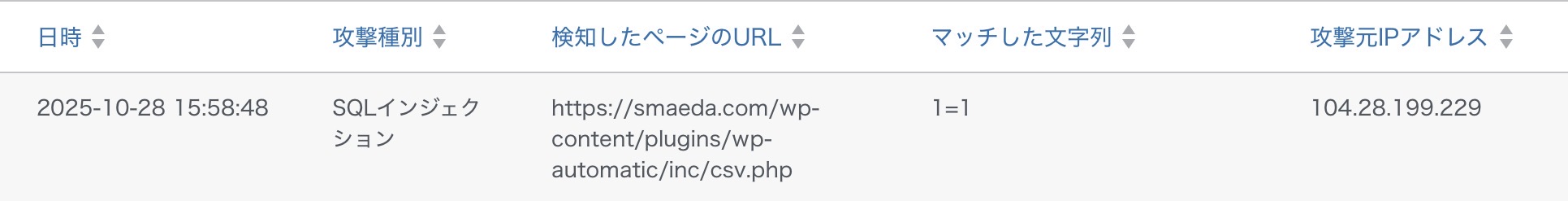 HOMENews 「SQLインジェクション」攻撃をブロックしました 2025年10月28日 News 21 Views 本日15:58にSQLインジェクション」攻撃を受け、WAFがブロックしました。 IPアドレスを調べるとアメリカからのアクセスのように偽装しているようです。同時刻に私のもう一つのブログにも同様の攻撃がありました。