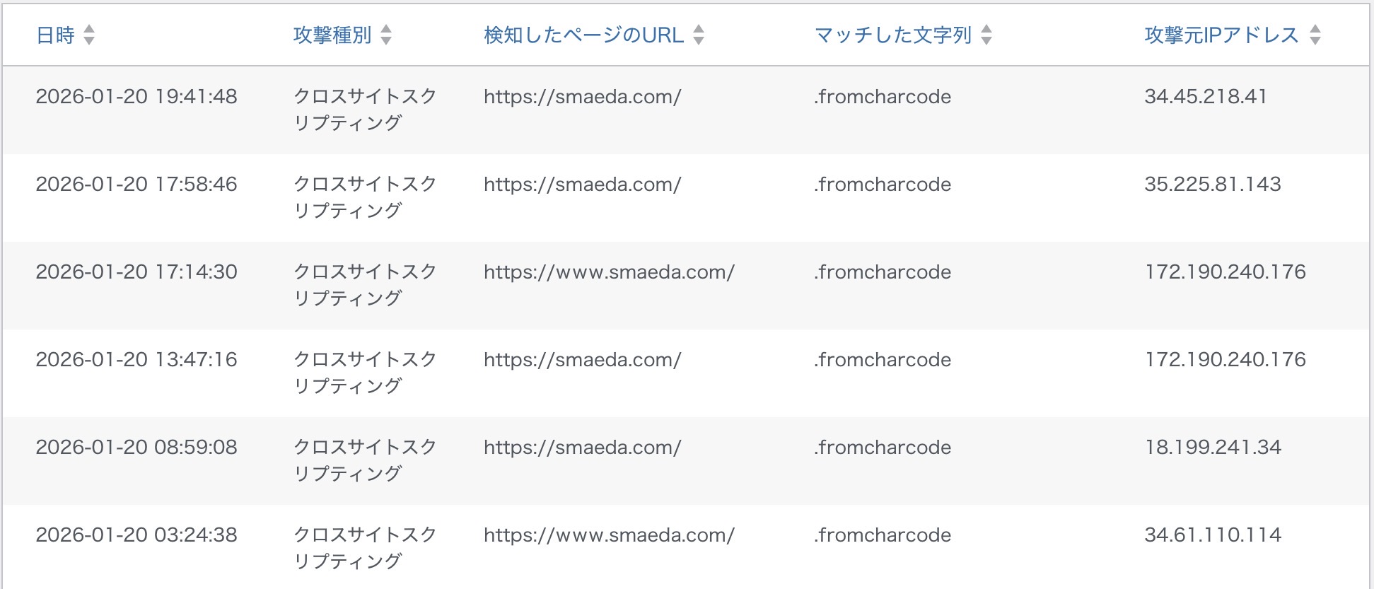 昨日(2026年1月19日 19:22)から本日(1月20日 3:24、8:59、13:47、17:14、17:58、19:41)にかけて7回の「クロスサイトスクリプティング」攻撃を受け、WAFがブロックしました。
