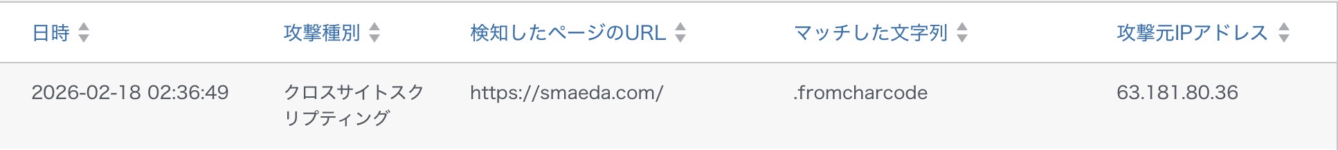 HOMENews 「クロスサイトスクリプティング」攻撃をブロックしました 2026年2月18日 News 6 Views 本日(2026年2月18日)2:36に「クロスサイトスクリプティング」攻撃を受け、WAFがブロックしました。 IPアドレスを含め昨日の攻撃と全く同じものでした。いつまで続くのでしょう。