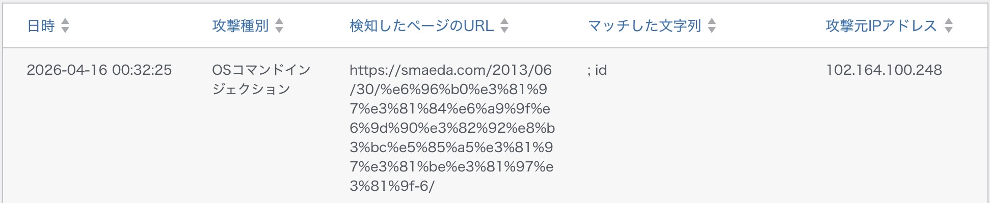 HOMENews 「OSコマンドインジェクション」攻撃をブロックしました 2026年4月16日 News 2 Views 本日(2026年4月16日 00:32)、「OSコマンドインジェクション」攻撃を受け、WAFがブロックしました。 IPアドレスはリビアからのアクセスであるように偽装されています。
